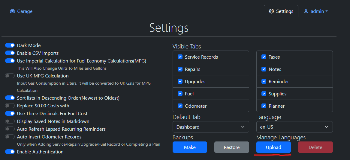 | If you require more fields than what is provided in LubeLogger, you can easily add more fields via the Additional Fields Manager located in the Settings tab. You have to be logged in as the root user in order to access this feature. | |