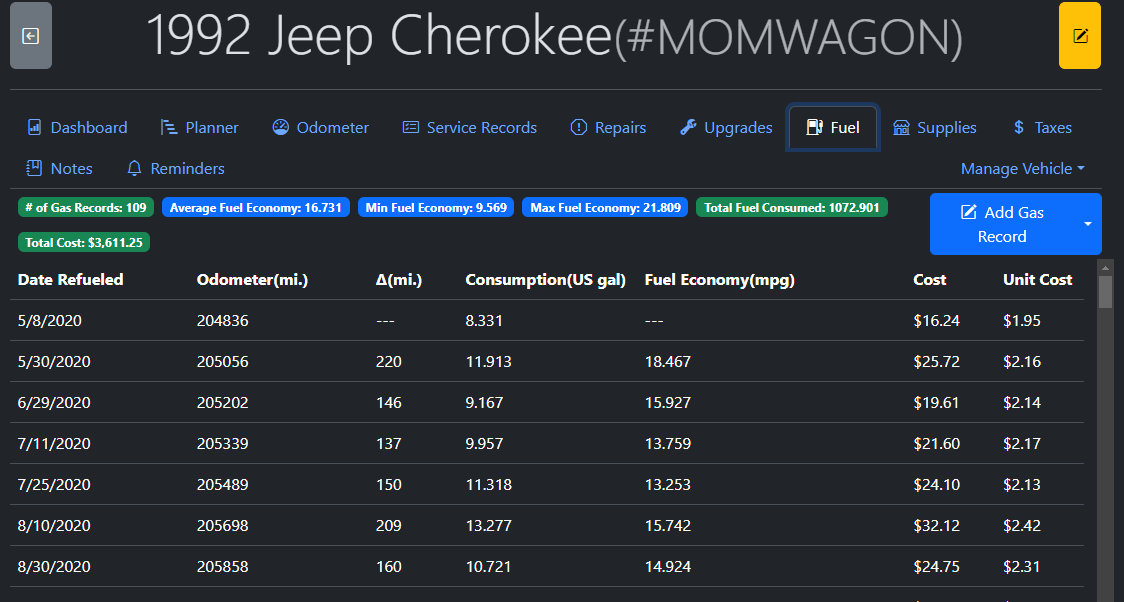 | The Distance Traveled chart relies solely on the odometer records found in [[Odometer|Records/Odometer]] | |