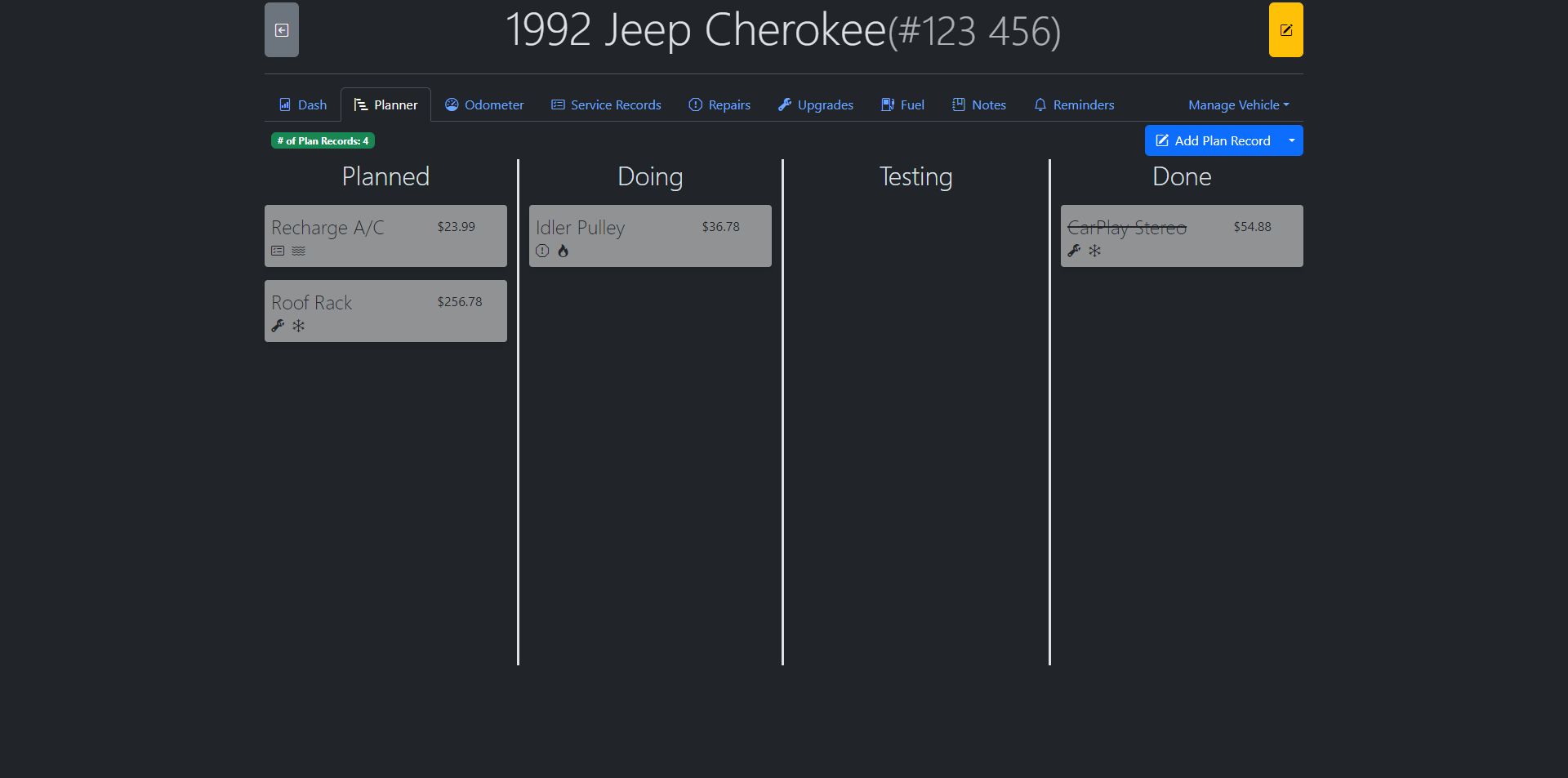 | To edit an existing vehicle, go into the vehicle details by clicking on the vehicle tile in the Garage. If you're on a computer/tablet, there will be a yellow button on the top right of the screen, click it to edit details regarding the vehicle. | |