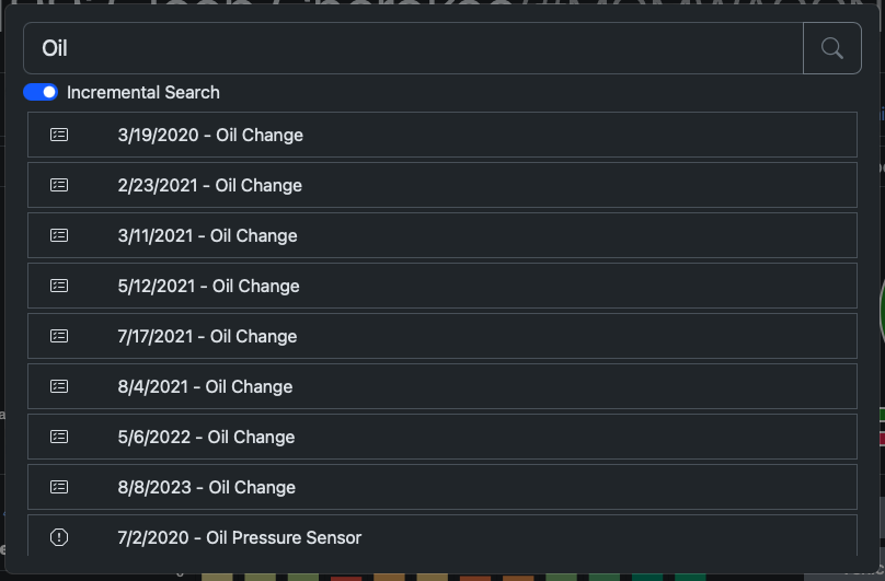 | The Global Search function allows the user to search for keywords across different records. Note that the search results are dependent on the visible tabs, i.e.: the user will not get results in Service Records if the Service Records tab is not visible. Incremental Search is enabled by default, which means that the app will search as the user is typing, this can cause performance issues if you have a large amount of records, so it is recommended that incremental search is disabled and search be performed manually by either pressing the Enter key or clicking the Search button. | |